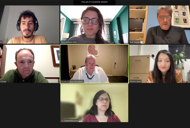 Course leaders, speakers and ISN staff prepare for an online interactive session as part...