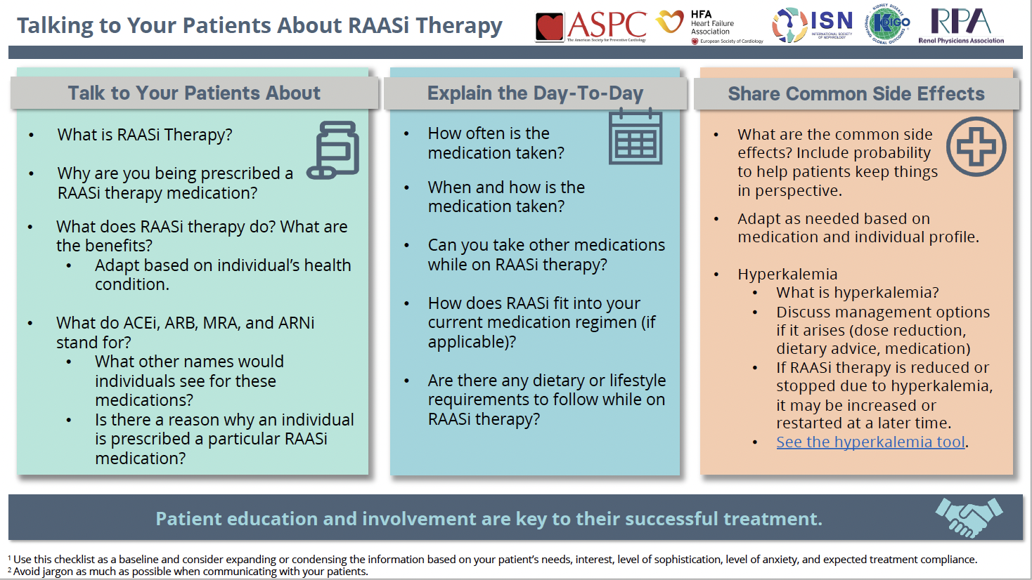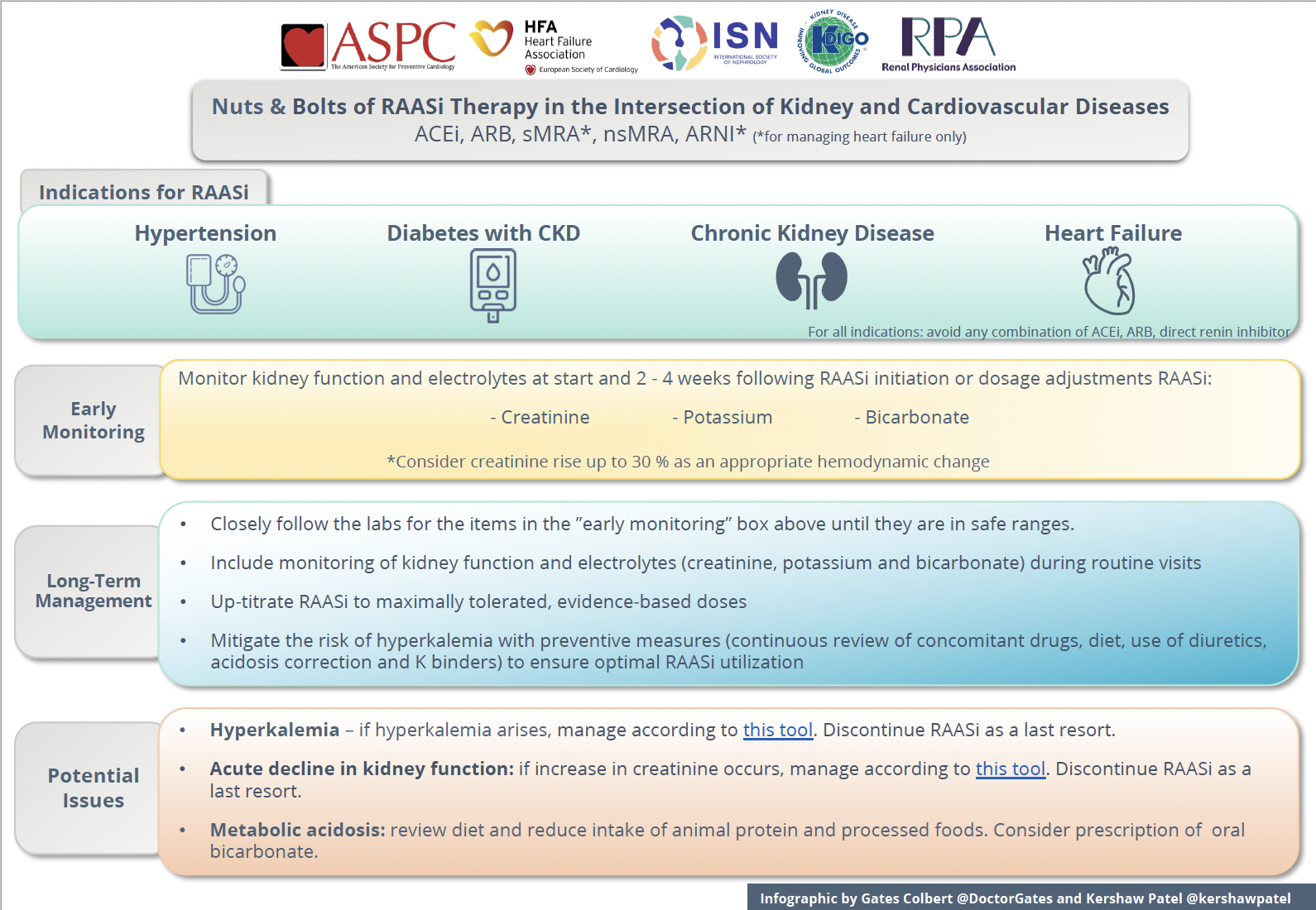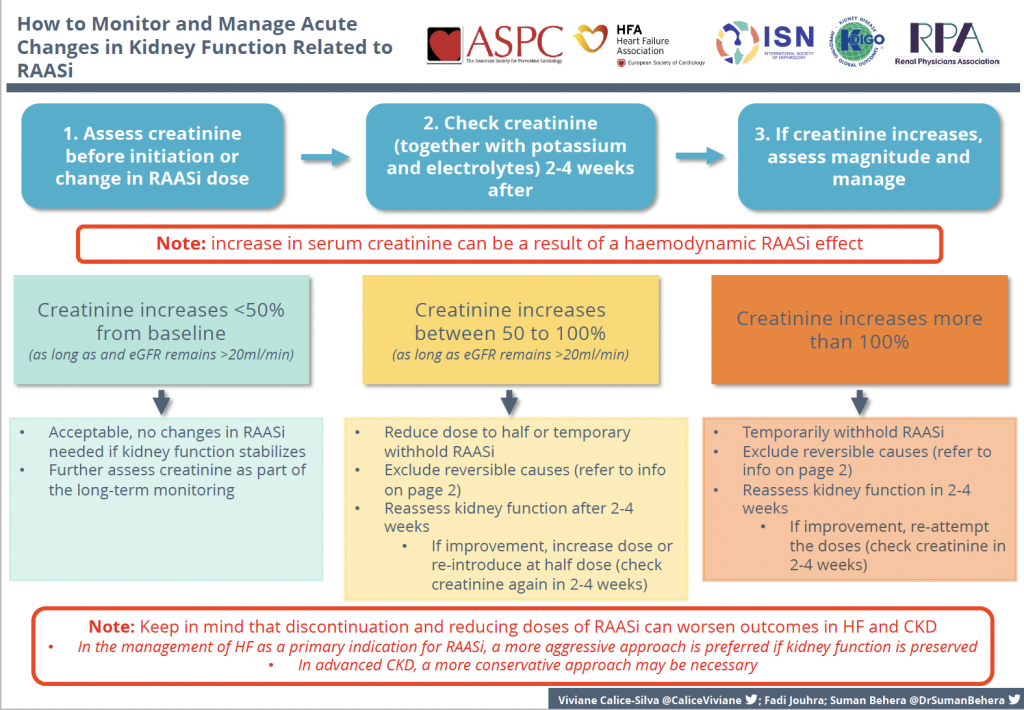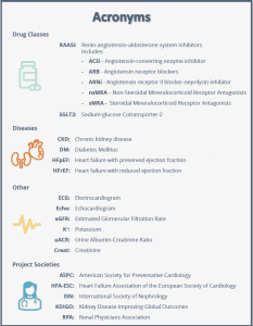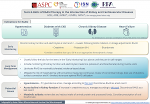 In 2021, the International Society of Nephrology (ISN) convened a group of nephrologists and cardiologists from the American Society for Preventative Cardiology (ASPC), the Heart Failure Association of the European Society of Cardiology (HFA), Kidney Disease Improving Global Outcomes (KDIGO), the Renal Physicians Association (RPA), and the ISN, to co-create toolkits for advancing the prevention and management of cardio-kidney complications. The first topic selected by the group for such tools is the optimization of RAASi therapy.
