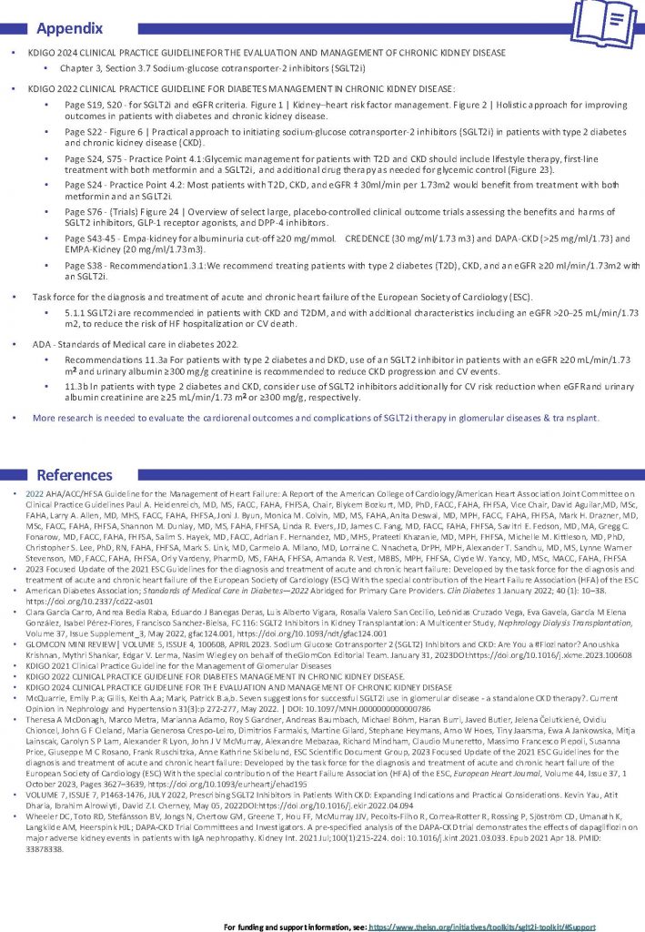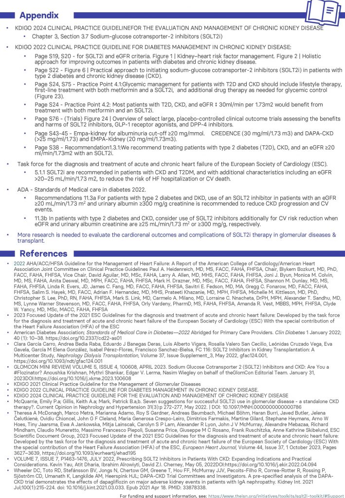 9. Krishnan A, Shankar M, Lerma EV, Wiegley N; GlomCon Editorial Team. Sodium Glucose Cotransporter 2 (SGLT2) Inhibitors and CKD: Are You a #Flozinator? Kidney Med. 2023 Feb 1;5(4):100608. doi: 10.1016/j.xkme.2023.100608. PMID: 36915368; PMCID: PMC10006698.