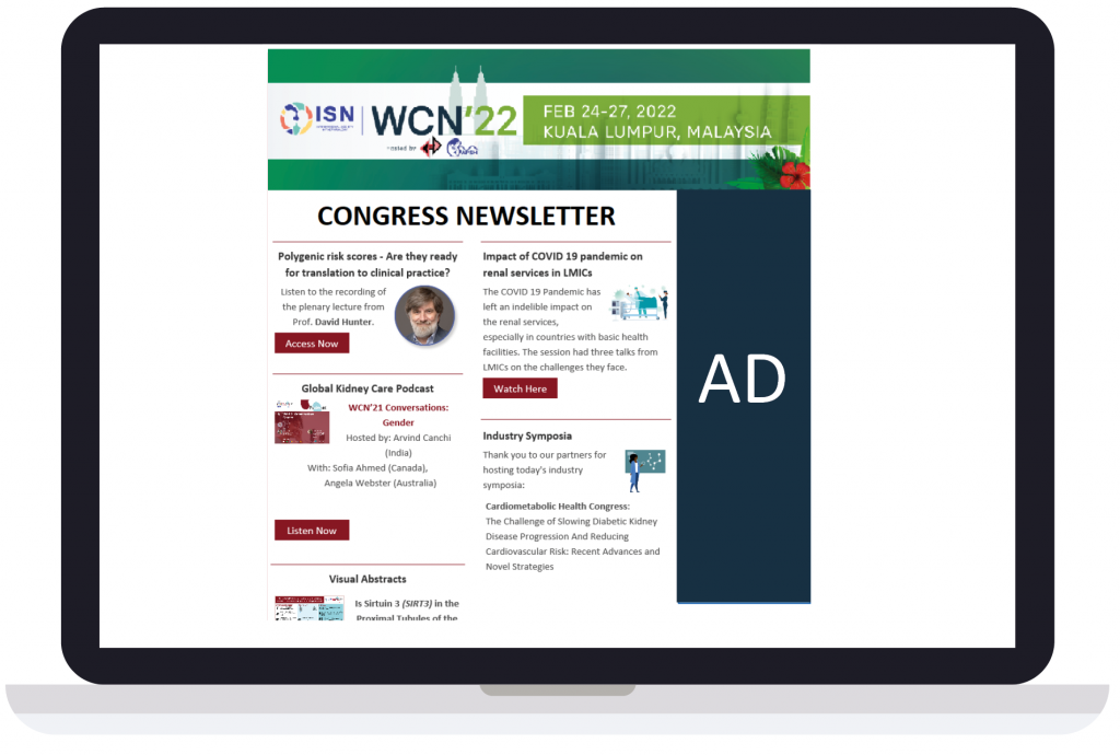 A special series of the popular ISN Global Kidney Care podcast will released for the congress. Organized by the ISN Education Team, they will highlight key events with special guests. Podcasts are published on ISN Academy and various platforms (Apple, Stitcher, Deezer, Spotify). Maximum 3 multi-sponsors.