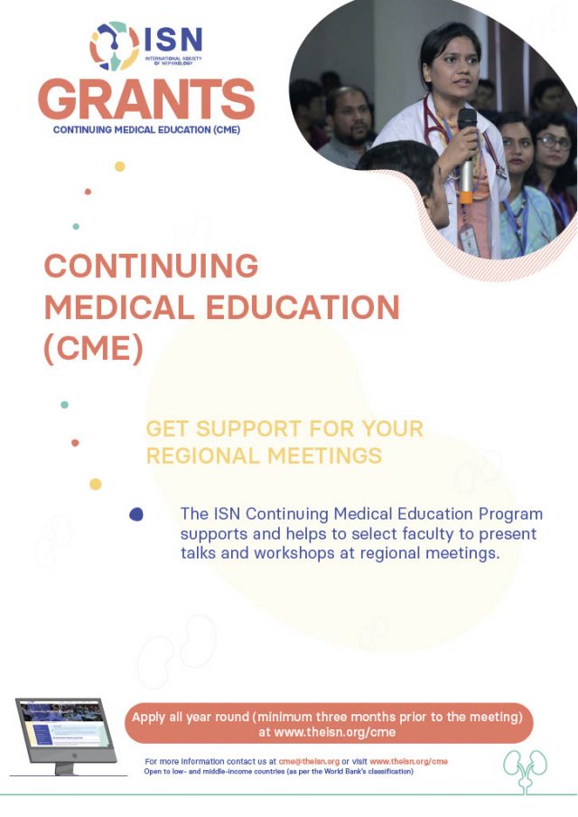 Through the Continuing Medical Education (CME) Program, ISN supports faculty to present talks and workshops at regional nephrology-related meetings, bringing expert speakers together from around the world to share knowledge and experience in clinical care and research.