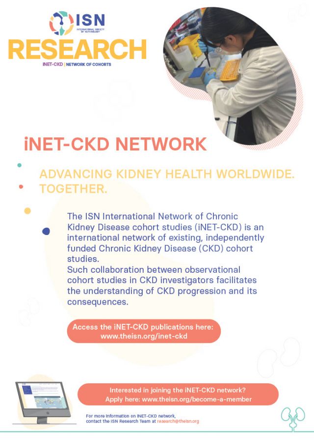 The ISN International Network of Chronic Kidney Disease cohort studies (iNET-CKD) is an international network of existing, independently funded Chronic Kidney Disease (CKD) cohort studies. Such collaboration between observational cohort studies in CKD investigators facilitates the understanding of CKD progression and its consequences.