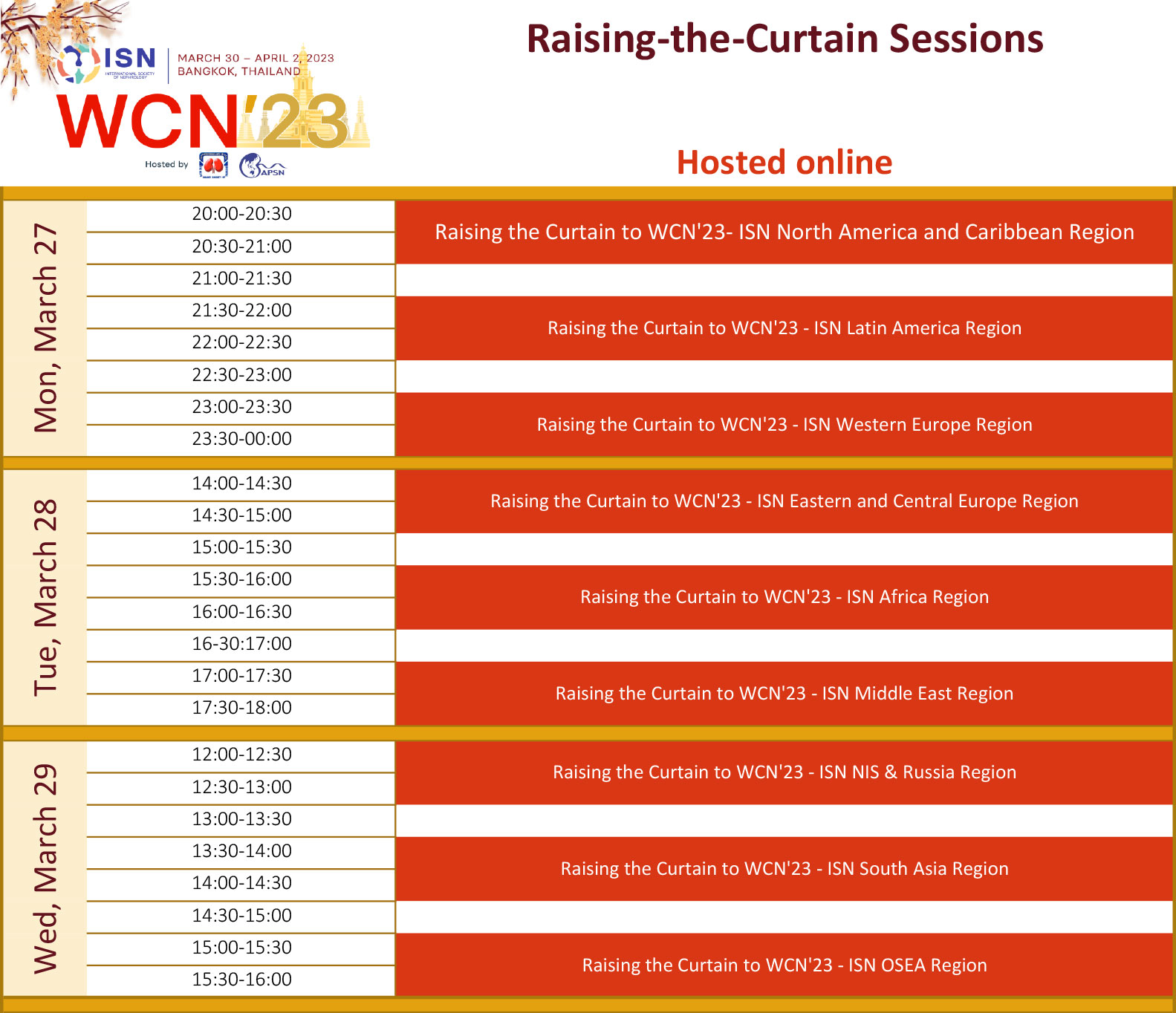 ISN Collective-Member Societies and Regional Societies, and representatives of the ISN regions, will join and co-host a series of inspiring Raising-the-Curtain sessions leading to the official opening of the WCN’23 on March 30, 2023.