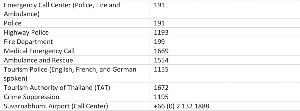 The international health and medical insurance should permit a transfer or repatriation in case of emergency. There are modern hospital and emergency facilities in Bangkok and the congress organizers and hotel staff can advise if required.