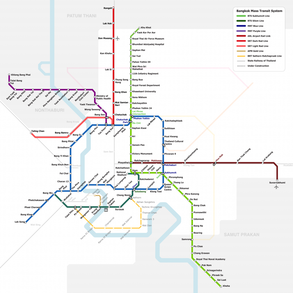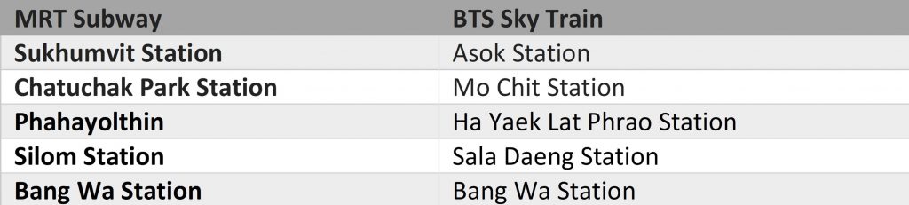 The MRT and BTS Sky Train intersect at the following stations, enabling passengers to connect to the different routes: