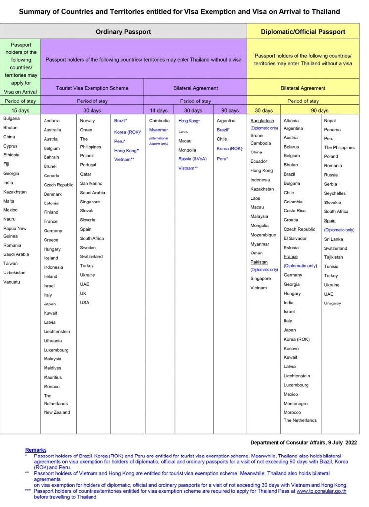 Passport holders from the following countries and territories are not required to obtain a visa when entering the Kingdom of Thailand for tourism purposes and will be permitted to stay for a period not exceeding 30 days per visit. For more information, please see Summary of Countries and Territories entitled for Visa Exemption, or consult http://www.mfa.go.th.