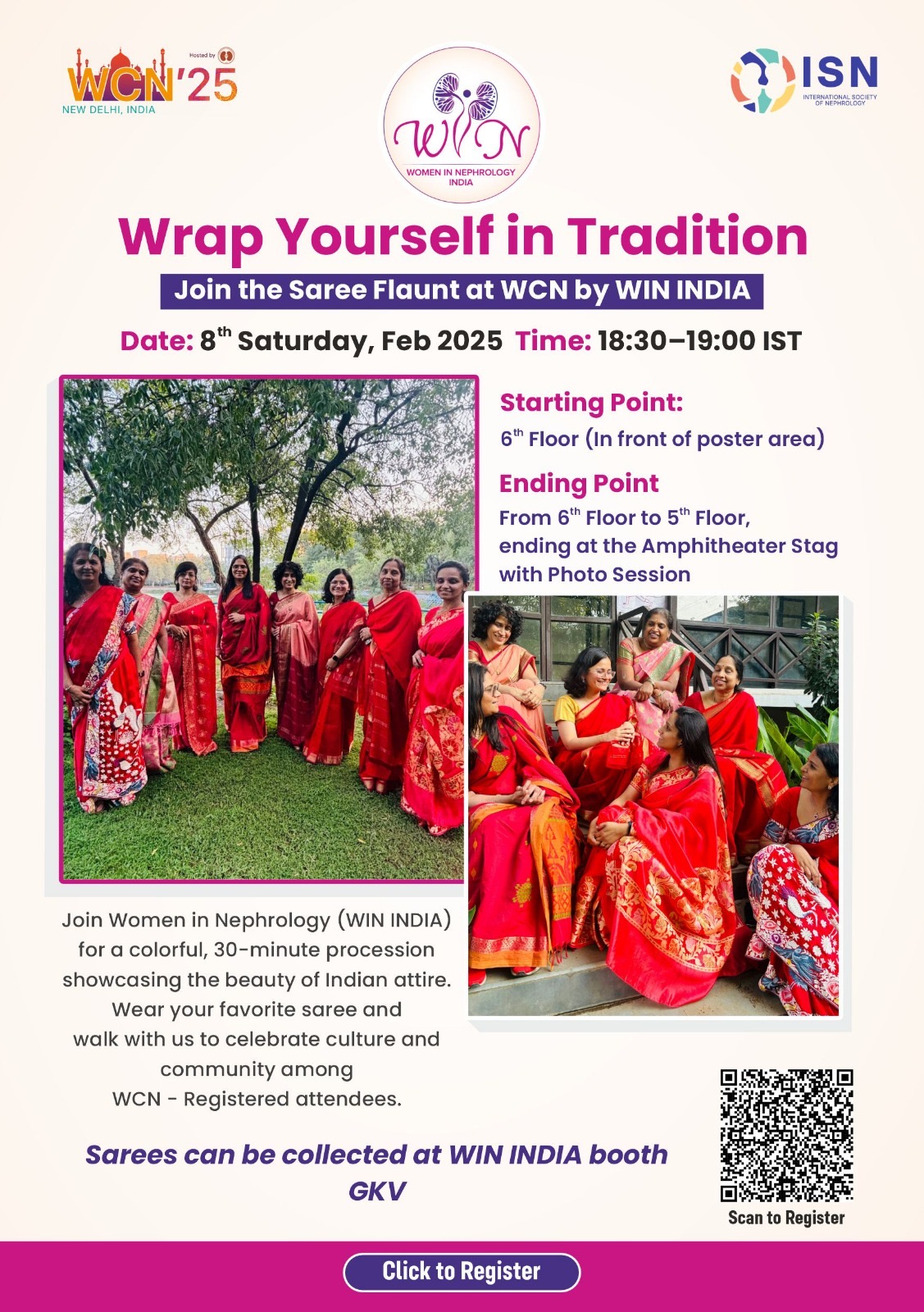 Join Women in Nephrology (WIN INDIA) for a colorful, 30-minute procession showcasing the beauty of Indian attire. Wear your favourite saree and walk with us to celebrate culture and community amount WCN – registered attendees.